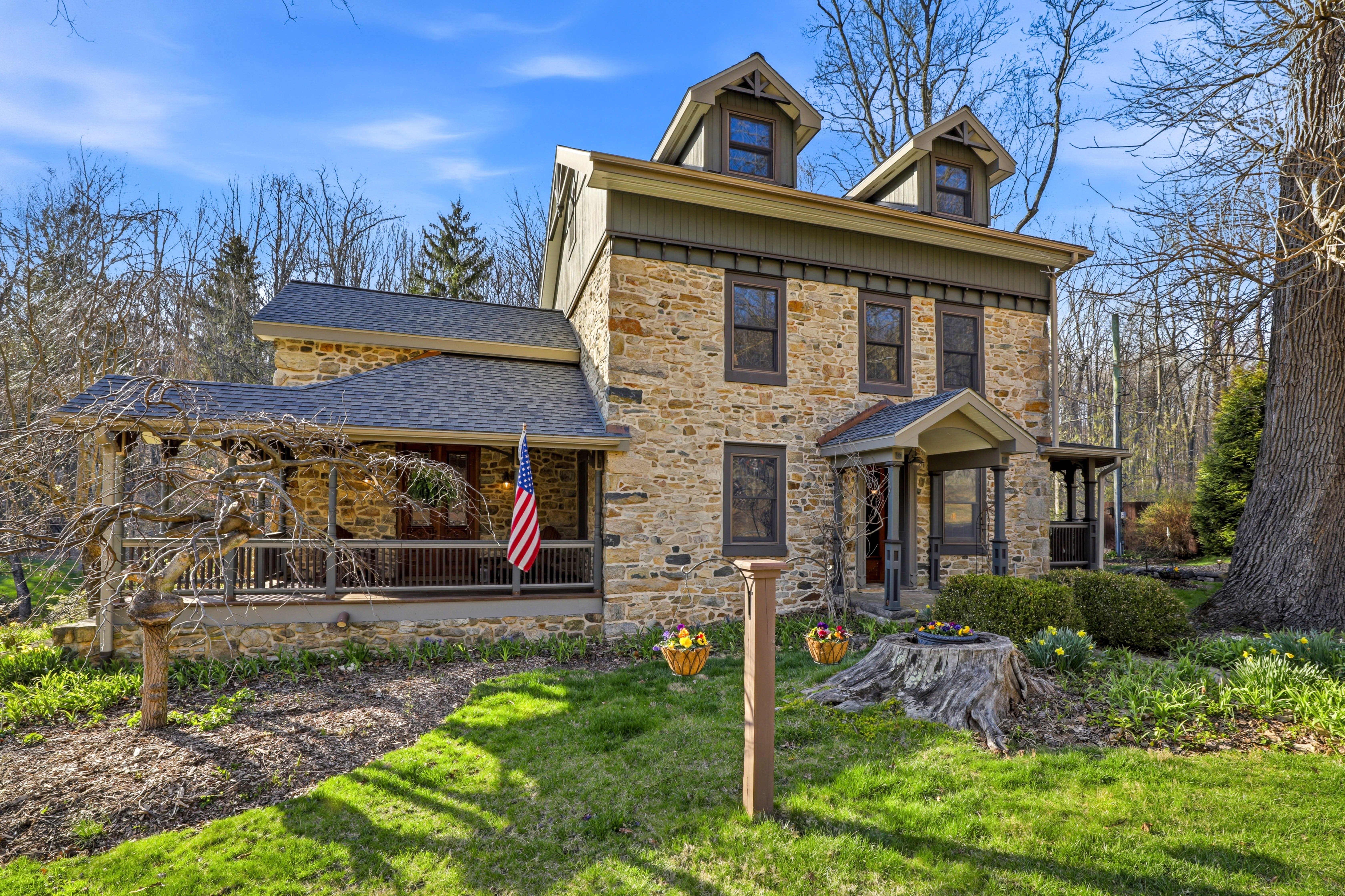 Set within 7 wooded acres in the storied landscape of Pennsylvania’s historic Oley Valley, this remarkable stone residence is less a house than a work of art, a sanctuary shaped across centuries and ultimately reimagined by nationally recognized sculptor and artist R. Scott Mundt. Originally constructed in 1790, with a stone addition completed in 1830, the home carries the quiet permanence of early American craftsmanship. In 1995, Mundt transformed the property through an artistic renovation that honored its heritage while infusing it with the sensibility of a working artist by blending sculpture, architecture, and daily living into a singular environment. Mundt approached the home as both canvas and refuge. His hand is present throughout: a monumental carved mantel anchoring the great room’s soaring fifteen-foot stone fireplace, raised wood paneling crafted with sculptural precision, and a custom kitchen thoughtfully built from the home’s original windows, preserving history through reinvention.